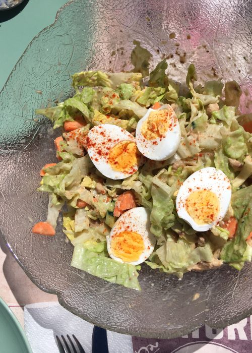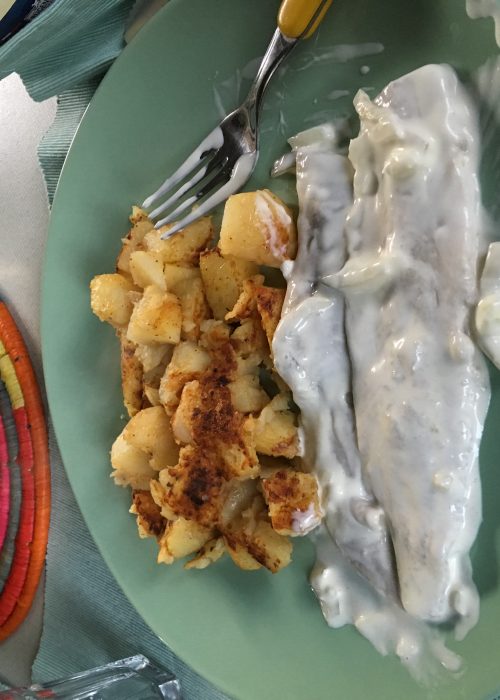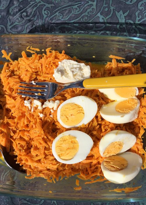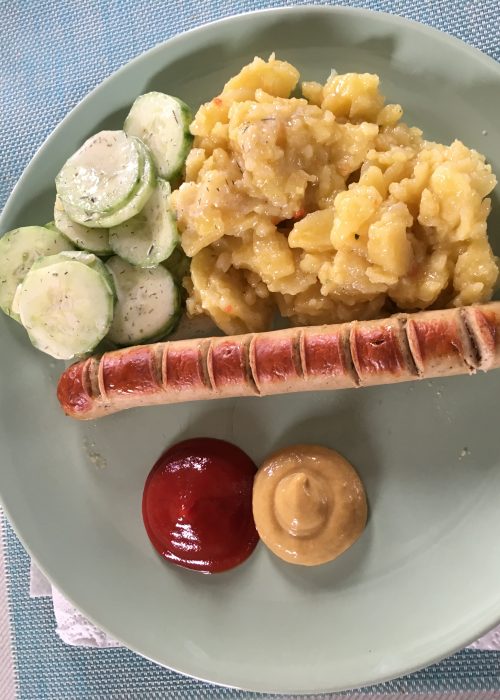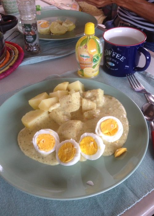 Gründonnerstag, Eier in Senfsahnesoße mit köstlichen französischen Salzkartoffeln und Karottensalat mit Curry! Heizung läuft, 30 Grad! Kuschelig und gemütlich in unserem kleinen Haus!