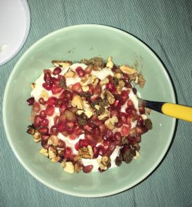 Als Topping 2 Esslöffel Granatapfelkerne und wenn vorhanden Dinkelchrunchys darüber streuen.